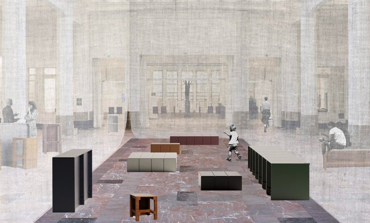 Ce projet est le fruit d’une collaboration entre l’artiste belge Michel François et le bureau d’architectes Giusto Van Campenhout, lauréats de l’appel à projets lancé en 2024 avec le soutien du Bouwmeester Maître Architecte. Leur intervention, à la fois discrète et audacieuse, dialogue avec l’architecture de Victor Horta et redonne au Hall une dimension plus humaine. Le voile monumental conçu par la designer textile Flore Fockedey crée une salle dans la salle, tandis qu’un tapis en trompe-l’œil, reproduisant les marbres originels, évoque les multiples vies de cet espace — salle des sculptures, salle des marbres, salle d’animation.