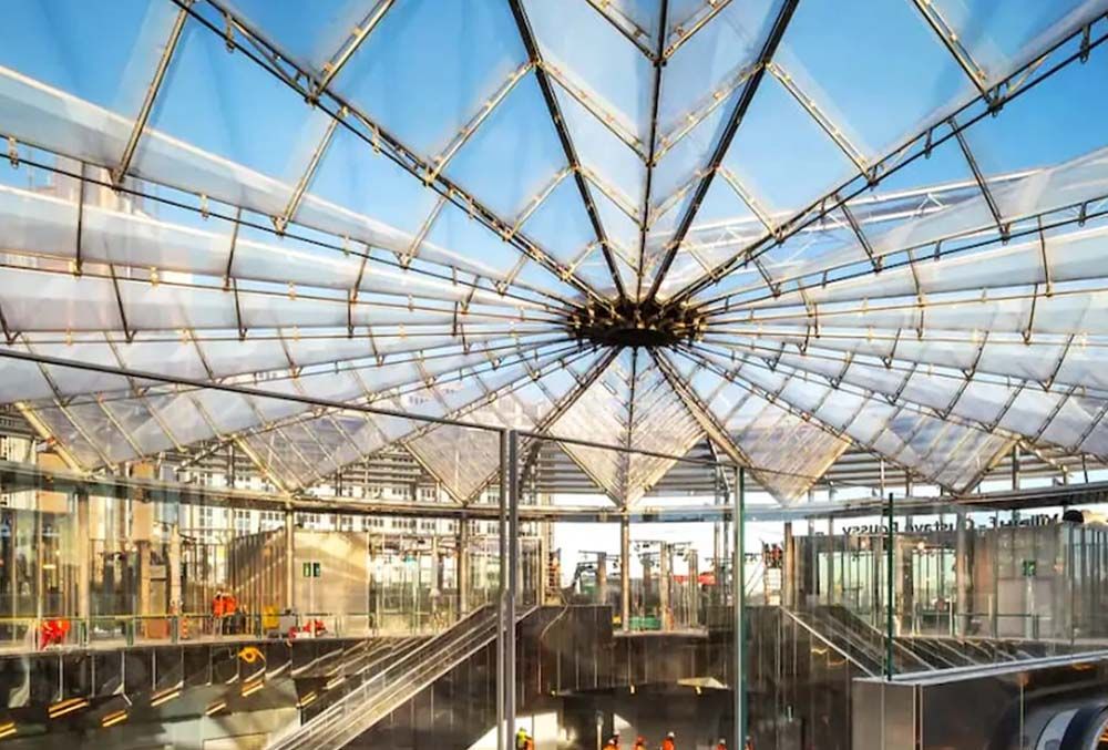 Les grands escaliers mécaniques, visibles sous la verrière, orchestrent une chorégraphie spatiale qui relie la ville et le sous-sol. Cette « architectonique du lien », selon les mots de Perrault, met en scène la verticalité des descentes et les flux horizontaux urbains, invitant le voyageur à ressentir pleinement la transition entre surface et profondeur. Ici, le vide devient un matériau, la transparence une structure, et la lumière un langage architectural à part entière.