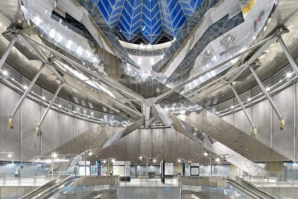 Sous ce volume aérien, un cylindre de 70 mètres de diamètre et 50 mètres de profondeur canalise la lumière naturelle jusqu’aux quais, transformant le parcours des voyageurs en expérience immersive.