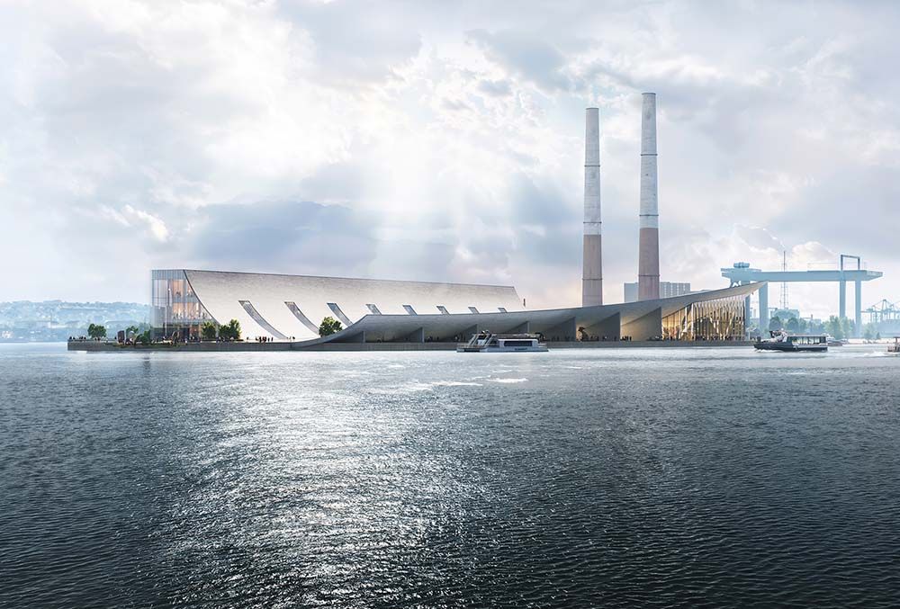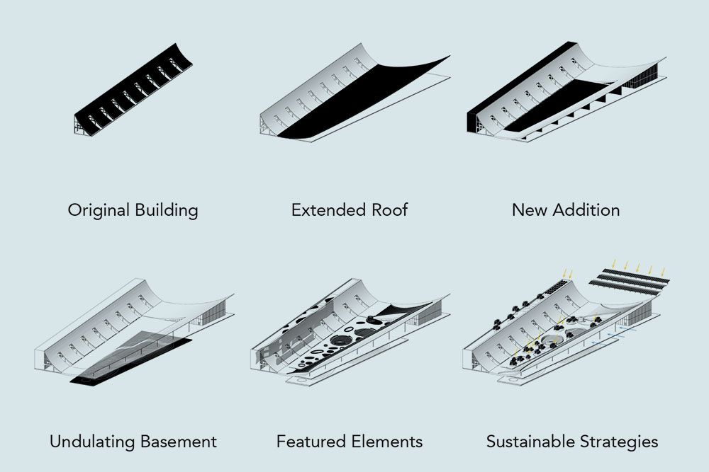 Un élément architectural structurant du projet réside dans l’extension de la toiture courbe existante, prolongée en une couverture continue le long du quai. Cette couverture organise les circulations, génère des espaces extérieurs ombragés et établit une transition spatiale entre les cheminements urbains et les activités portuaires. Sous cette toiture prolongée, une série d’espaces publics semi-ouverts et une cour abritée sont aménagés, permettant un accès depuis la promenade urbaine comme depuis l’eau. Le musée est ainsi conçu comme un environnement public connecté, plutôt que comme une destination isolée de son contexte.