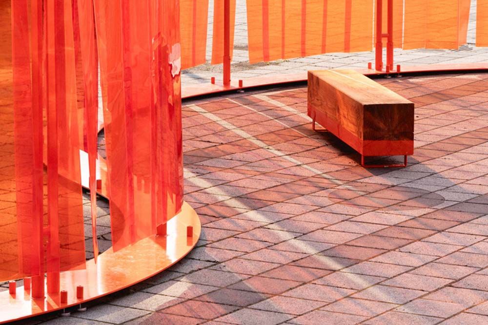 Conçue comme une structure modulaire et interchangeable, cette œuvre se compose d’éléments interchangeables. Le système comprend des mâts en acier et des rails cintrés auxquels sont suspendues des bandes de vinyle orange translucides. Généralement utilisées dans des contextes commerciaux et industriels pour leurs propriétés isolantes contre le froid, ces bandes agissent également comme écran acoustique face au bruit et à la poussière, ce qui est particulièrement utile à proximité des chantiers de construction.