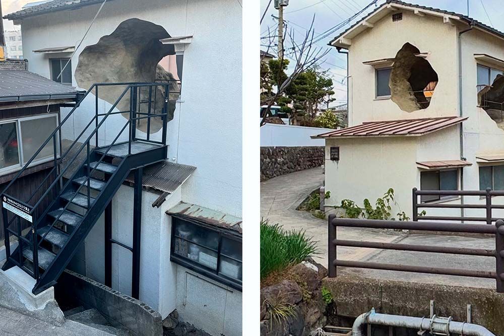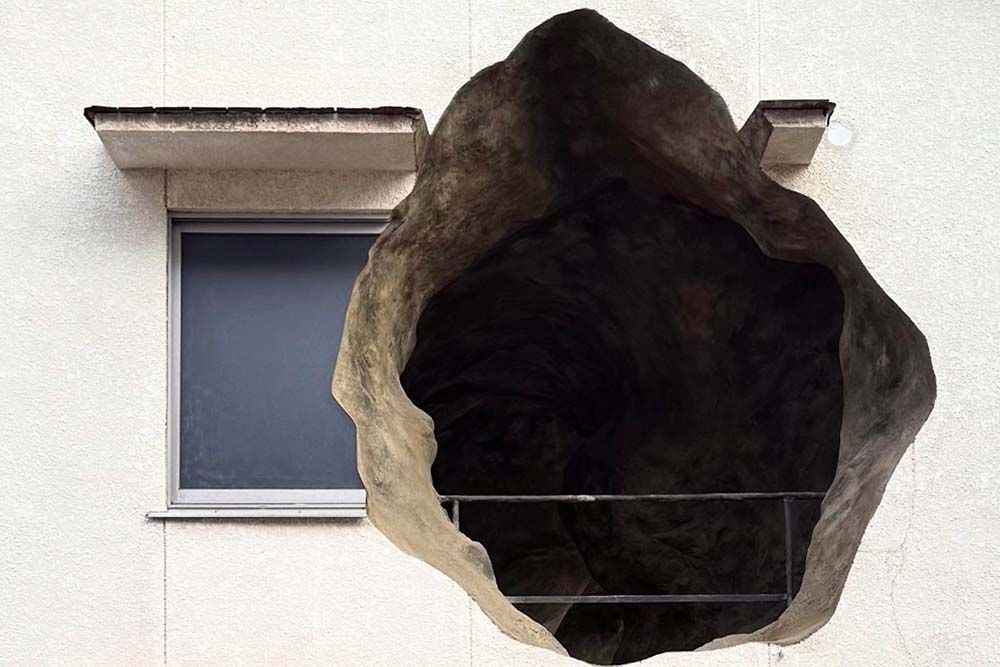 Située dans une rue résidentielle étroite, se dresse une maison discrète de deux étages qui, jusqu’à récemment, serait passée presque inaperçue. Mais cette dernière est percée de deux gigantesques ouvertures, aux contours bruts et géologiques, comme si le bâtiment avait été excavé de l’intérieur. Ce qui s’ouvre derrière la façade n’est pas une pièce, mais une caverne, une rupture qui évoque davantage une formation naturelle qu’un espace construit par l’homme.