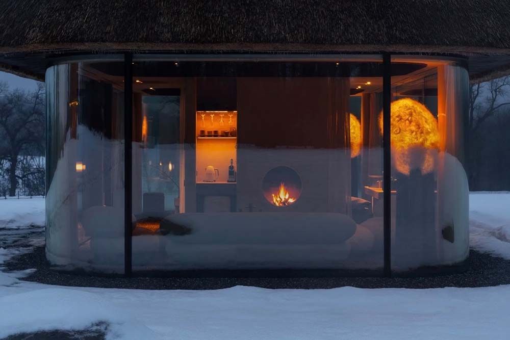Les baies vitrées ininterrompues renforcent l’impression d’immersion dans la nature, faisant du paysage une composante essentielle de l’expérience. Pour plus d’intimité, les hôtes peuvent fermer des rideaux épais mais légers, actionnés automatiquement par un panneau de commande situé près du lit.