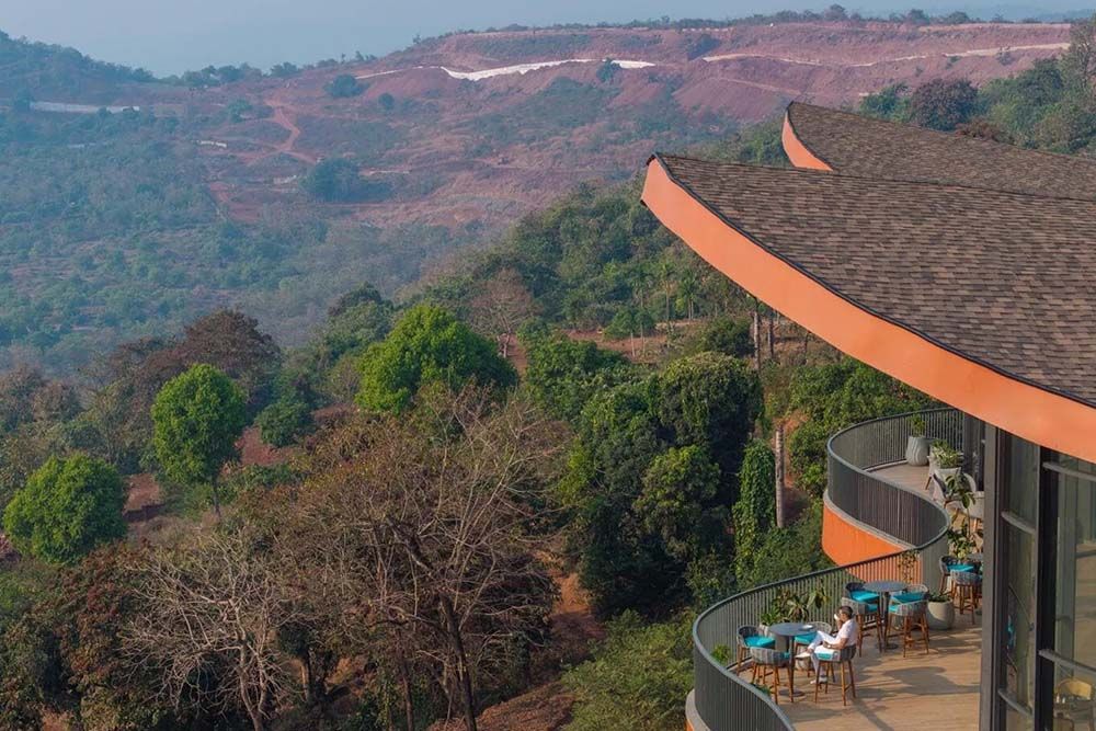 Situé sur une colline au relief abrupt dominant l’océan à Anjarle, dans l’État du Maharashtra en Inde, Crest Nine est un centre communautaire conçu comme un pôle de loisirs pour un ensemble de villas privées et dessiné par Sanjay Puri Architects. Le terrain s’abaisse fortement depuis la route d’accès, ce qui permet au bâtiment de se révéler progressivement depuis le relief naturel plutôt que de s’y poser simplement.