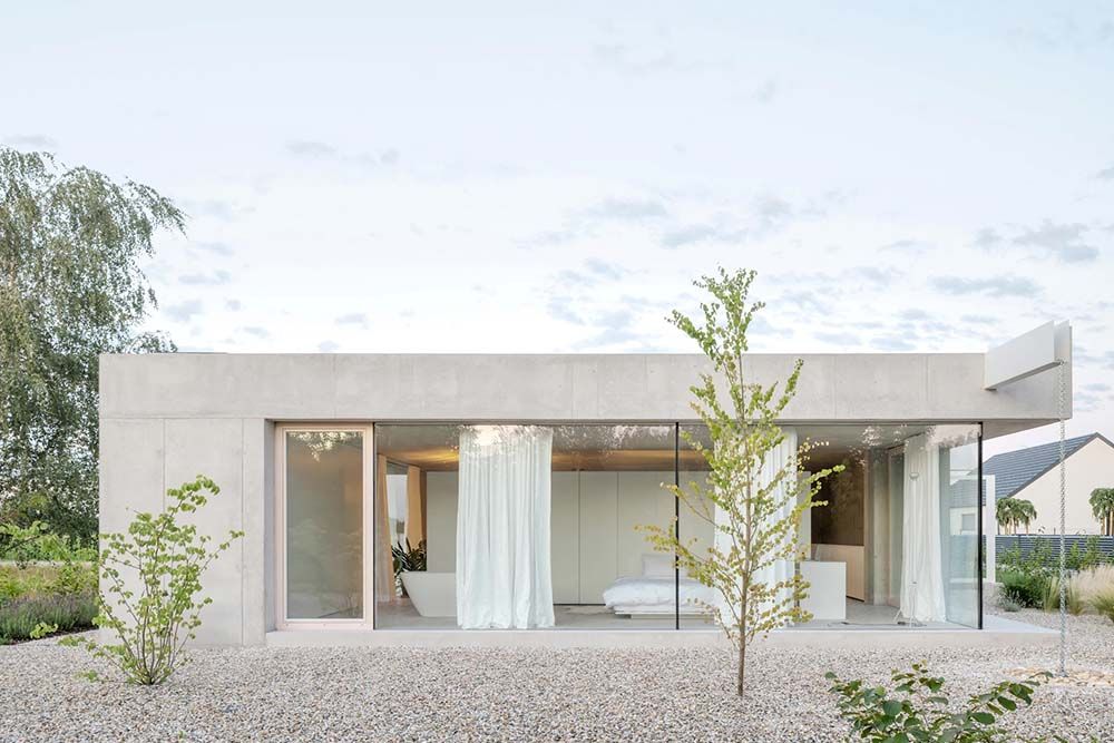 Le plan carré est réduit à l’essentiel : trois volumes de service clos, intégrés dans un unique espace de vie fluide et une baie vitrée panoramique qui se rétracte entièrement, abolissant la frontière entre intérieur et paysage ouvert. Le projet privilégie la sobriété au détriment du spectaculaire, proposant la maison comme un écrin spatial discret pour la lumière, les saisons et le quotidien.