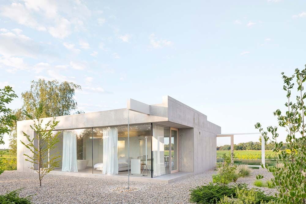 La maison est conçue comme une succession de volumes bas, articulés horizontalement, qui épousent l’horizontalité de la plaine pannonienne et s’intègrent à l’échelle environnante sans imposer de figure dominante.