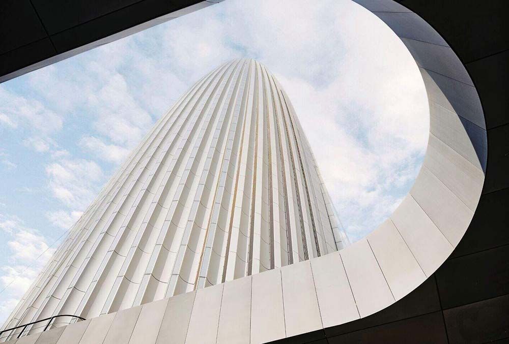 D’une superficie totale de 102 800 m², la tour abrite un programme mixte ambitieux : un hôtel de luxe Waldorf Astoria, des bureaux, des appartements haut de gamme ainsi qu’une plateforme panoramique offrant une vue imprenable sur la région. Conçue par les architectes Rafael de la Hoz et Hakim Benjelloun, elle est desservie par 36 ascenseurs, dont 21 dans la tour elle-même et 15 dans le podium.