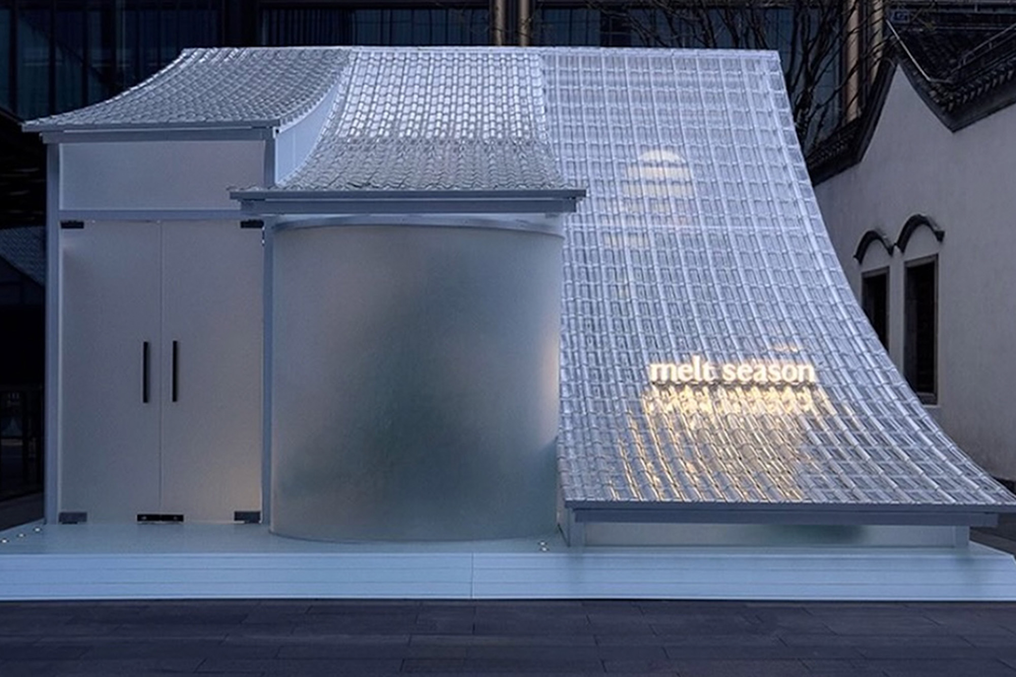 Cette conception de mlkk.studio pour la parfumerie Melt Season réinterprète la structure traditionnelle des toits de style Hui, de Nankin, et se caractérise par trois travées de toitures cintrées parallèles.
