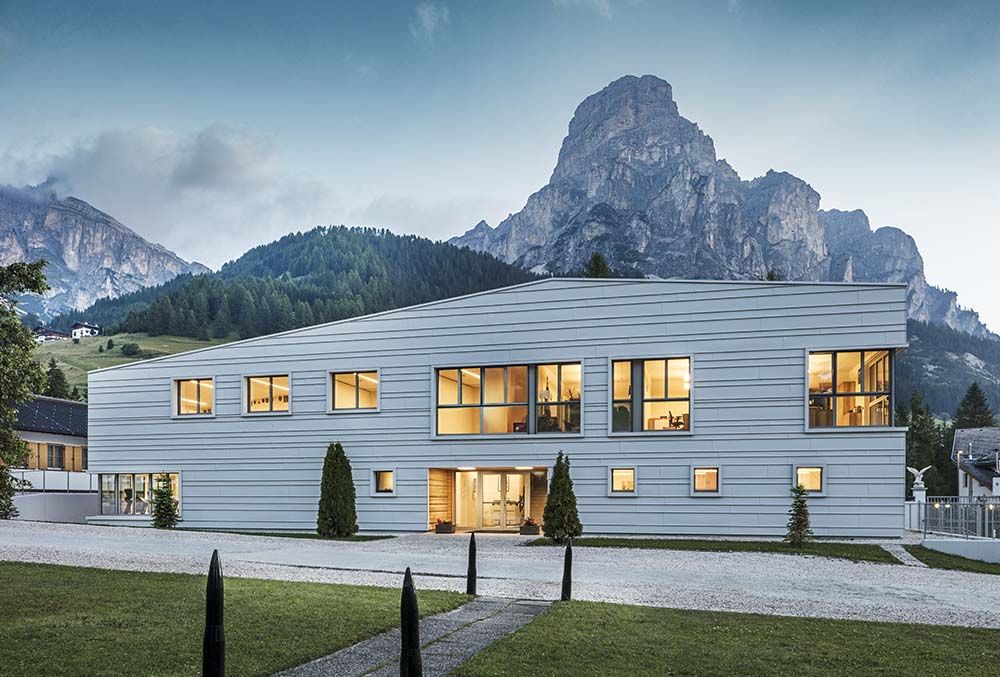 Les architectes ont délibérément écarté l’image rustique des constructions alpines traditionnelles. Leur choix s’est porté sur une écriture claire et homogène : façades et toitures en aluminium PREFALZ (P.10 blanc Prefa). Ce matériau combine légèreté, durabilité et esthétique. Son fort pouvoir réfléchissant réduit l’impact du rayonnement solaire en altitude et contribue à un confort thermique accru. L’architecture s’intègre ainsi au paysage de manière changeante : blanche et discrète l’hiver, lumineuse et contrastée l’été.