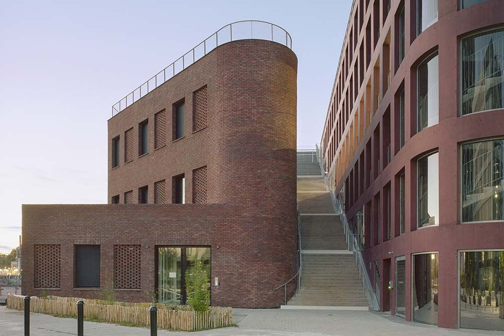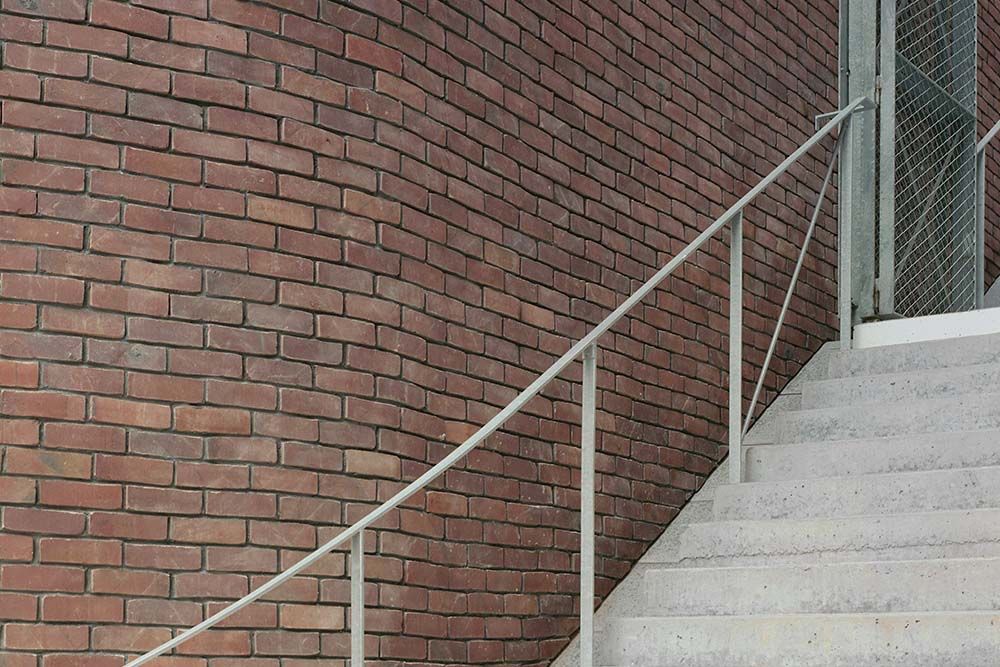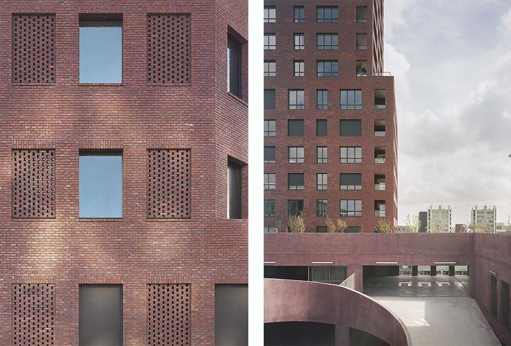 Les parkings sont caractérisés par un exosquelette de béton coloré sur place et des sols en béton brut. Les immeubles d'habitation et de bureaux occupés par SNCF Réseau sont visuellement unis par la brique Vande Moortel N10 brick E, qui a principalement été utilisé sous forme de plaquette de parement. Cette brique rouge-brun confère à l'ensemble un aspect puissant et naturel grâce à son caractère authentique. Le mode de fabrication artisanal de cette brique garantit sa nuance naturelle au cachet affirmé. Le brique de parement NATURE10 brick E est produite selon la technique Wasserstrich, et s'intègre parfaitement dans le tissu urbain existant. Pour rompre le caractère massif, les bâtiments utilisent des sections de façade incurvées et des ouvertures de fenêtre répétitives, avec des grilles de fenêtre décoratives qui ajoutent une nuance supplémentaire, à l'image des moucharabiehs traditionnels. Bien évidemment, la brique et non les plaquettes de parement ont été utilisés pour les parties en moucharabieh.