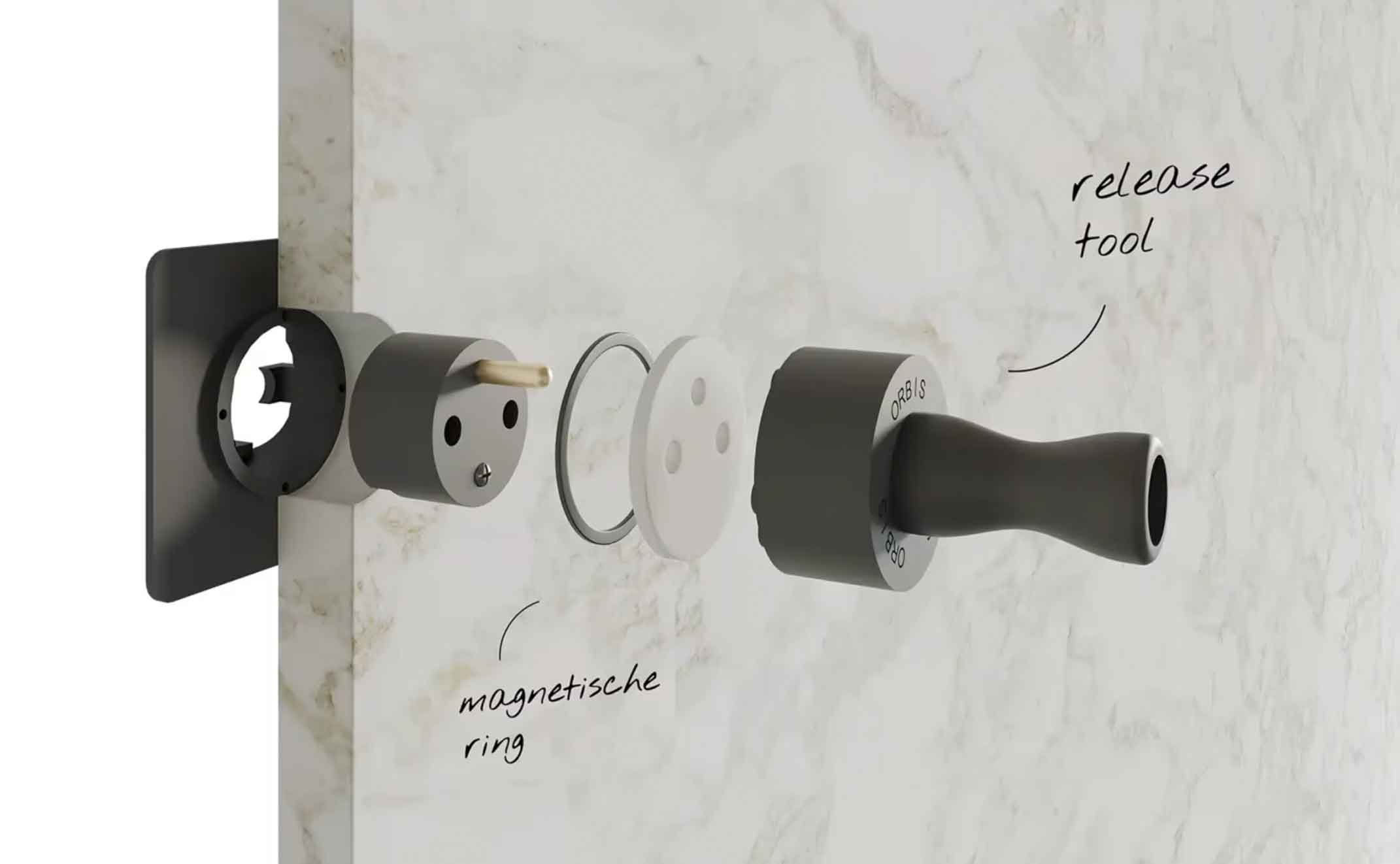 Orbis s’adapte, pas l’inverse. Qu’il s’agisse de marbre, de quartzite, de céramique ou de solid surface, la finition de la prise suit fidèlement la texture et la couleur du matériau choisi. Elle ne vient donc plus rompre l’esthétique, mais s’y intègre en toute discrétion. Grâce à un anneau magnétique et à l’outil Orbis Release Tool, la plaque de recouvrement peut être retirée facilement, sans force ni risque d’endommagement. Résultat : une installation sûre, précise et d’une grande simplicité d’utilisation.