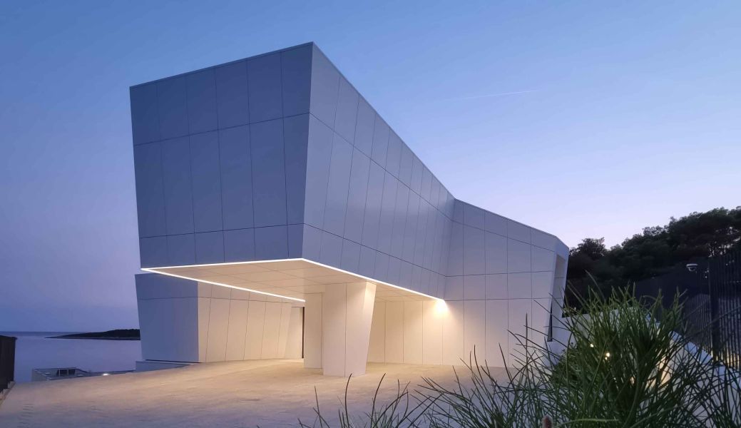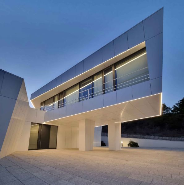 La façade joue un rôle central dans le projet et a été réalisée en panneaux Kerrock solid surface. Des panneaux blancs sont disposés et assemblés selon différents angles, créant un ensemble dynamique et sculptural, évoquant des formes maritimes. L’alternance des plans et des lignes génère un subtil jeu d’ombres et de profondeur, donnant à la façade un caractère évolutif au fil de la journée. Associée aux volumes en porte-à-faux, cette géométrie renforce l’impression d’une architecture semblant flotter au-dessus du terrain.